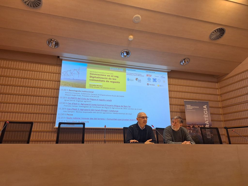 El Vicepresidente, Simeón Abad y la responsable de los Servicios Agronómicos y Medioambientales de la CGR del Canal de Aragón y Cataluña, Inés Samperi, participaron en la Jornada que llevaba por título "Innovacions en el reg. Digitalització de les comunitats de regants", celebrada dentro de los actos previstos en el Agrobiotech Innovation Forum 2025 en Lleida.